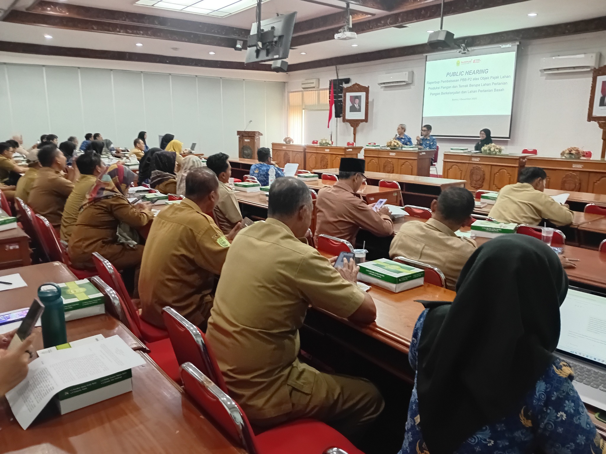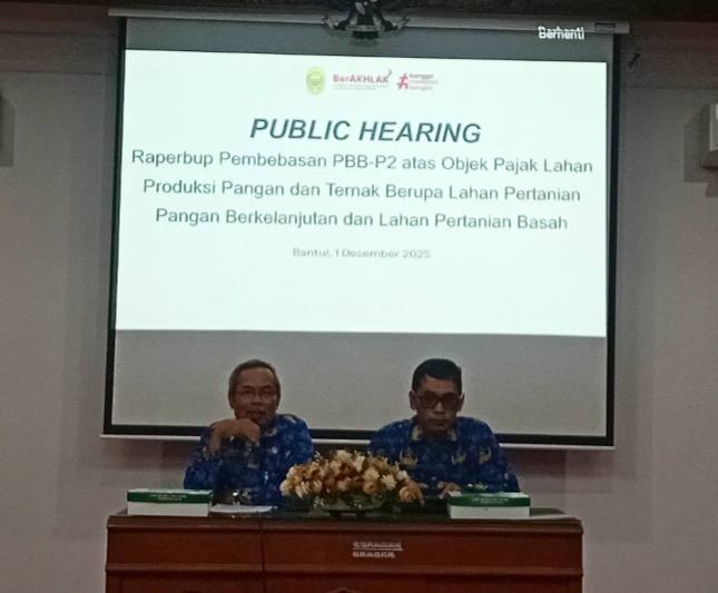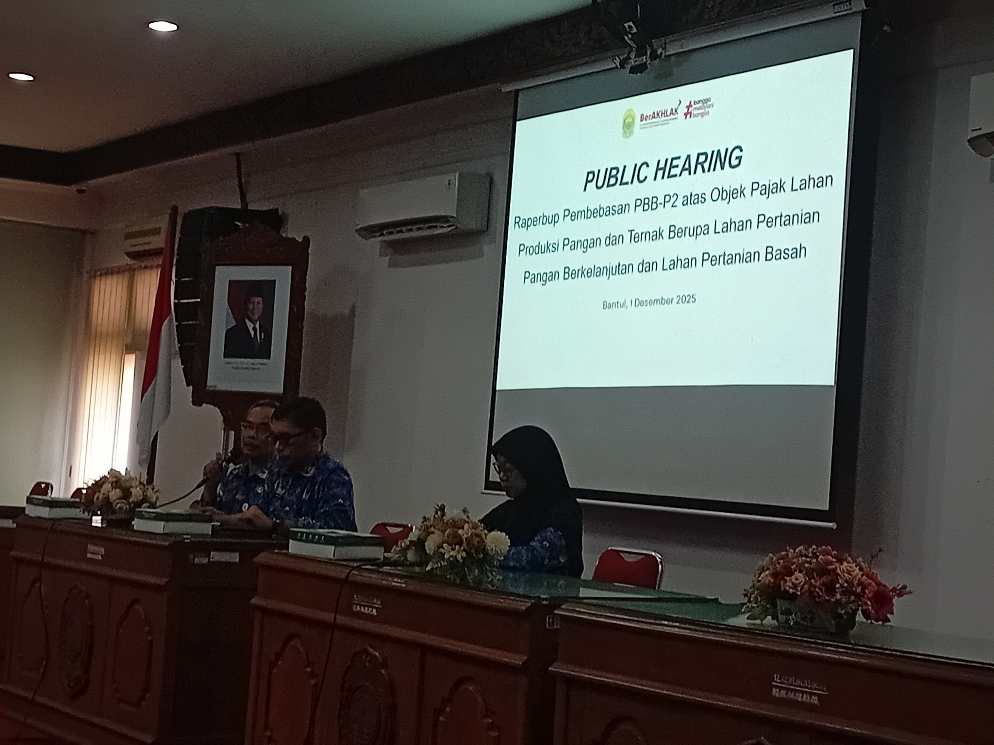 Bagian Hukum Sekretariat Daerah Kabupaten Bantul pada Senin 1 Desember 2025 bertempat di Gedong Induk Komplek PARASAMYA Bantul menyelenggarakan Sosialisasi Public Hearing/Penjaringan Aspirasi Masyarakat atas Rancangan Peraturan Bupati Bantul (raperbup) tentang Pembebasan PBB-P2 atas Objek Pajak Lahan Produksi Pangan & Ternak Berupa Lahan Pertanian Pangan Berielanjutan & Lahan Pertanian Basah.