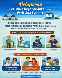 SelengkapnyaMelaporkan Peristiwa Kependudukan dan Peristiwa Penting bukan sekadar mengurus dokumen, tetapi juga memastikan hak-hak kependudukan, akses layanan publik, dan keakuratan data pemerintah terpenuhi. Di lingkungan masyarakat, pelaporan ini juga penting bagi pemangku wilayah seperti Ketua RT dan Dukuh agar mengetahui secara akurat kondisi dan keberadaan warga, sehingga memudahkan pendataan, pelayanan, serta penanganan berbagai kebutuhan sosial di wilayahnya. Setiap penduduk harus...
